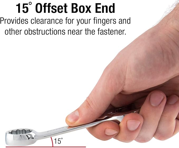 - BOX END OFFSET BY 15 DEGREES: Provides clearance for your fingers and other obstructions near the fastener.