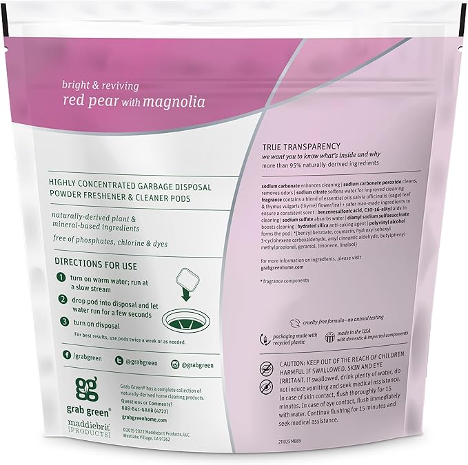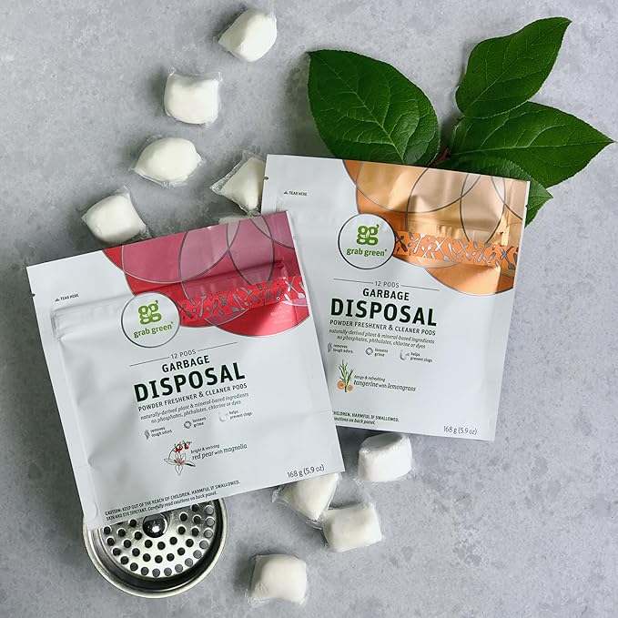 - Contains 1 - 12 pod pouch of Grab Green Garbage Disposal Freshener & Cleaner Pods, Thyme + Fig Leaf.