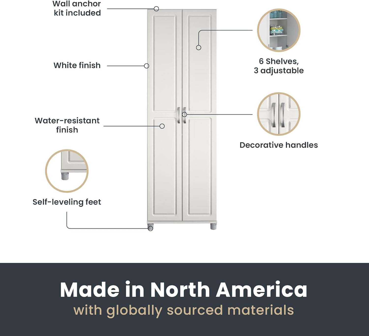 - The 5 shelves, 3 adjustable, can store and organize your cleaning supplies and even kitchen pantry items. Soft closing hinges prevent slamming doors. Adjustable feet keep your Cabinet level on uneven floors