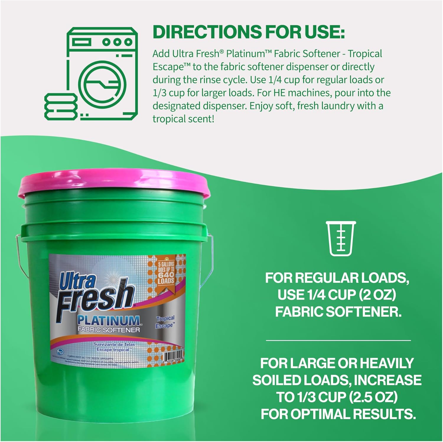 Ultra Fresh 5 Gallon Platinum Fabric Softener for All Machine Types, Liquid Laundry Softener, Up to 640 Loads, Tropical Escape