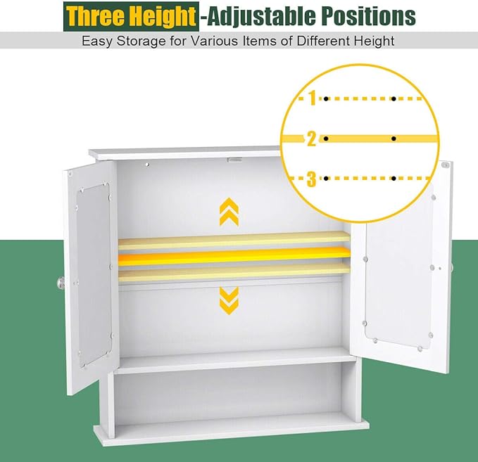 - Multi-function Use: Bathroom wall cabinet is ideal for bathroom, bedroom, living room or kitchen. It features enclosed shelf with double mirror doors, and one open shelf to place towels, soap, tissues and other decorative items. In addition you can also put some green small plants on the open shelf to make your item neat and beautiful.
