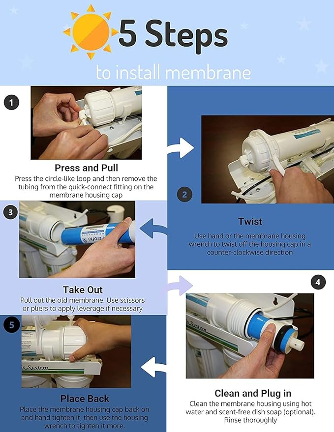 - Extended Filter Life: The replacement of Stages 1 to 3 RO filters typically lasts around 6-12 months, while the membrane and the 5th stage inline reverse osmosis water filter can extend up to 1 year