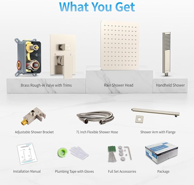 - What You Get: Rainfall shower head with handheld combo with rough-in valve, 12" brushed nickel rain shower head, handheld shower head, 71" (1.8m) extra long shower hose, 360°adjustable shower holder, 16" long shower arm, installation manual and install hardware.