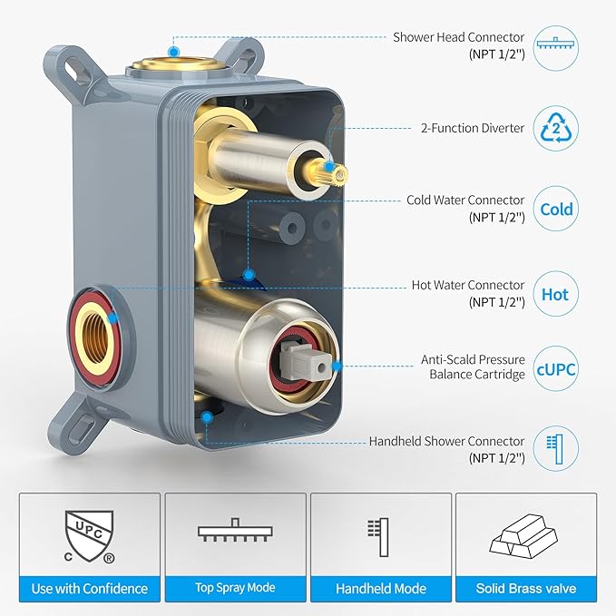 - cUPC Certification:The EMBATHER shower valve and trim kit is cUPC certified and compliant with the ASME A112.18.1-2018/CSA B125.1-18 standard, designed for use with standard 1/2" U.S. plumbing connections, and approved by the California Energy Commission. Flow Rate is 1.75 Gallons Per Minute (6.6L/min).