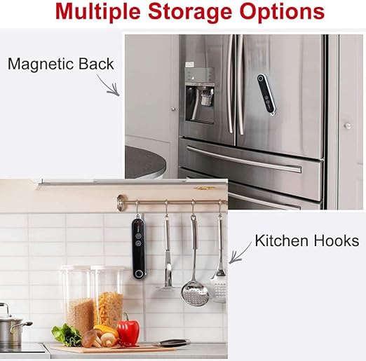 - Convenient storage: Digital thermometer for cooking with foldaway probe, features a magnetic back to allow you to easily attach to refrigerator or any metal surface; a hanging hole for your kitchen hooks or a lanyard