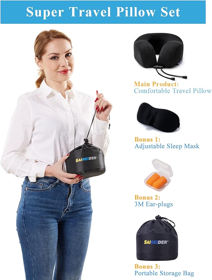 SAIREIDER Neck Pillows for Travel 100% Memory Foam Adjustable Travel Pillows with Storage Bag, Sleep Mask and Earplugs-Prevent The Heads from Falling Forward (Black)