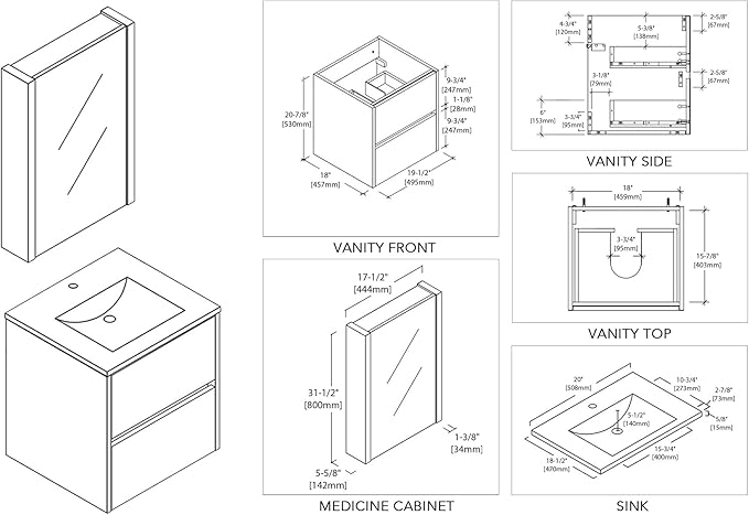 Blossom Valencia 20" Inches Single Bathroom Vanity, Wall Hung Bathroom Vanity with Ceramic Sink, Mirror Medicine Cabinet, All Wood Floating Bathroom Vanity Glossy White 016 20 01MC