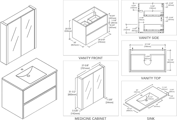 - Quick Assembly & Complete Package: Comes pre-assembled for minimal setup, saving time and installer effort. Included: Vanity cabinet, ceramic sink and mirror medicine cabinet. Not Included: Mirror, faucet, pop-up drain, P-trap, or other accessories. Backed by a 1-year manufacturer warranty for added peace of mind.