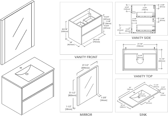- Quick Assembly & Complete Package: Comes pre-assembled for minimal setup, saving time and installer effort. Included: Vanity cabinet, ceramic sink and mirror. Not Included: Faucet, pop-up drain, P-trap, or other accessories. Backed by a 1-year manufacturer warranty for added peace of mind.