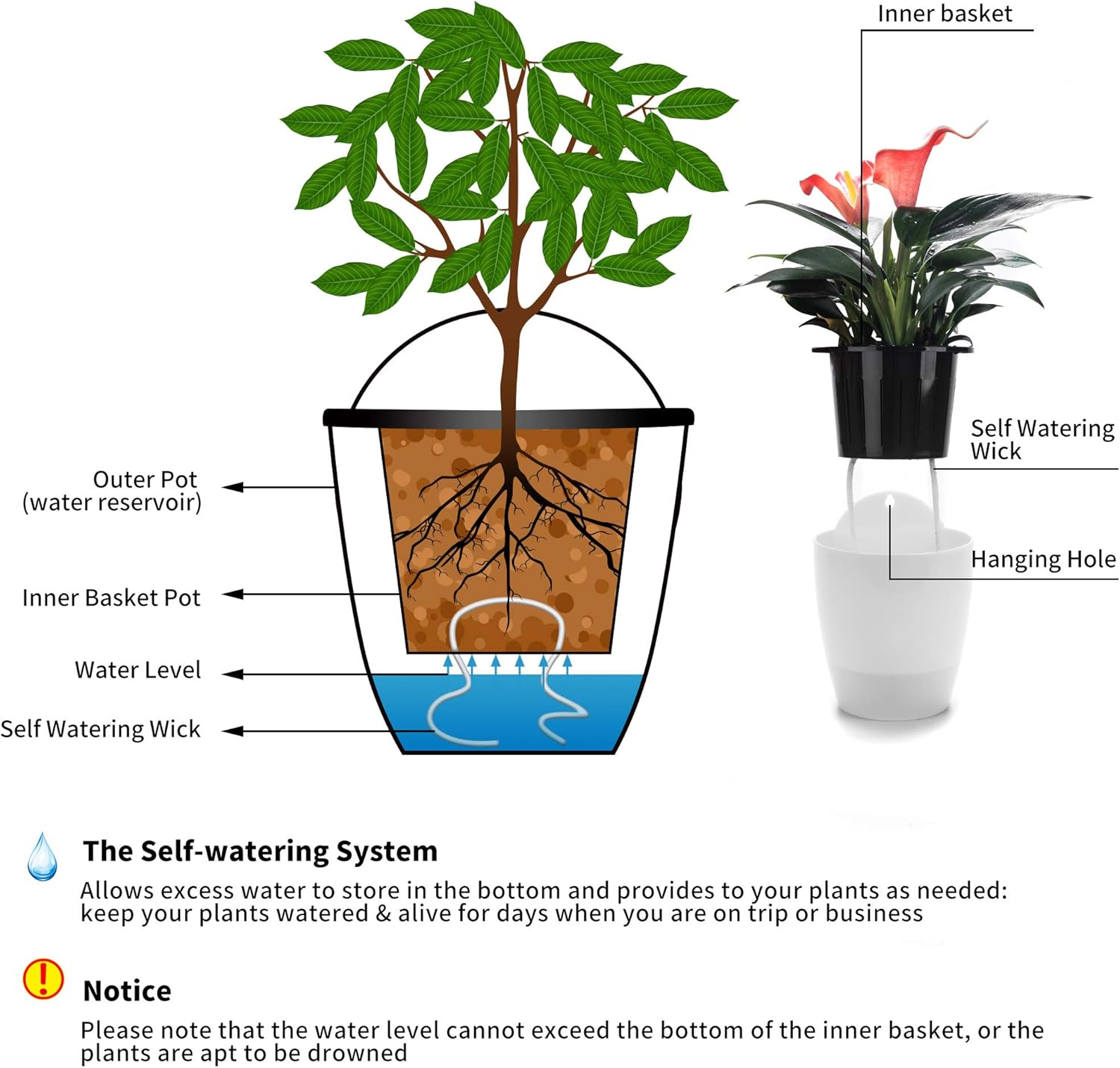 - Self-watering Wall Planter: Hanging planter pots designed with double-layer to allow excess water to store in bottom of this self-watering planter and provide to your plants as needed: automatically suck the water and nutrients up from the bottom of the outer cup via cotton rope wick to ensure plants take enough water they need for days, and you don't have to water them frequently. This clever hanging flower pots may help you care your plants when you go outside a couple days or on business.