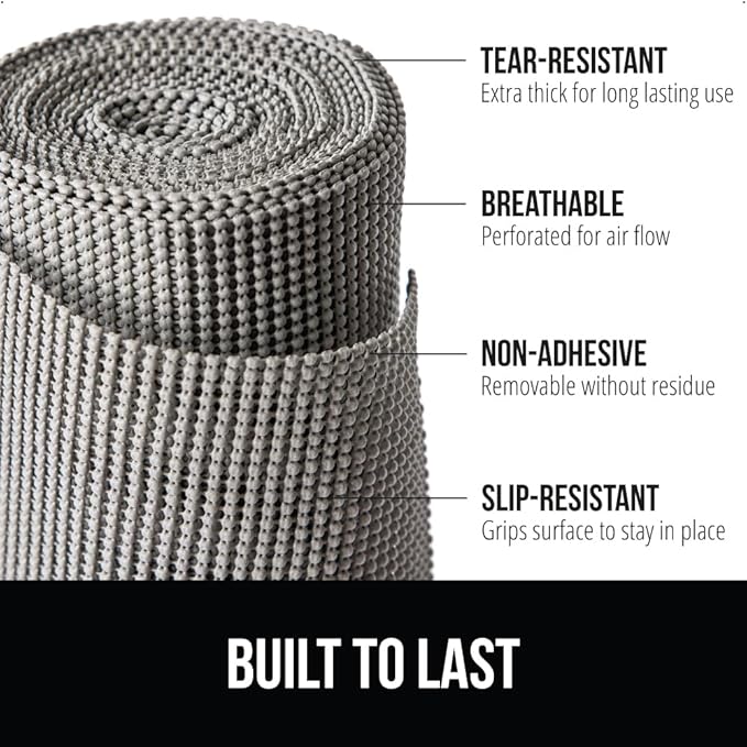 - EXTRA STRONG GRIP NON-ADHESIVE LINER: the Gorilla Grip powerGRIP liner is a non adhesive and tear resistant liner engineered with the highest quality materials to reduce slipping and bunching in your drawers or cabinet shelves; superior gripping technology keeps both the liner in place on surfaces