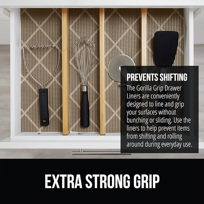 - KEEP ITEMS IN PLACE: thick and durable Gorilla Grip Drawer and Shelf Liners line your drawers and effectively helps to prevent items from moving and shifting around