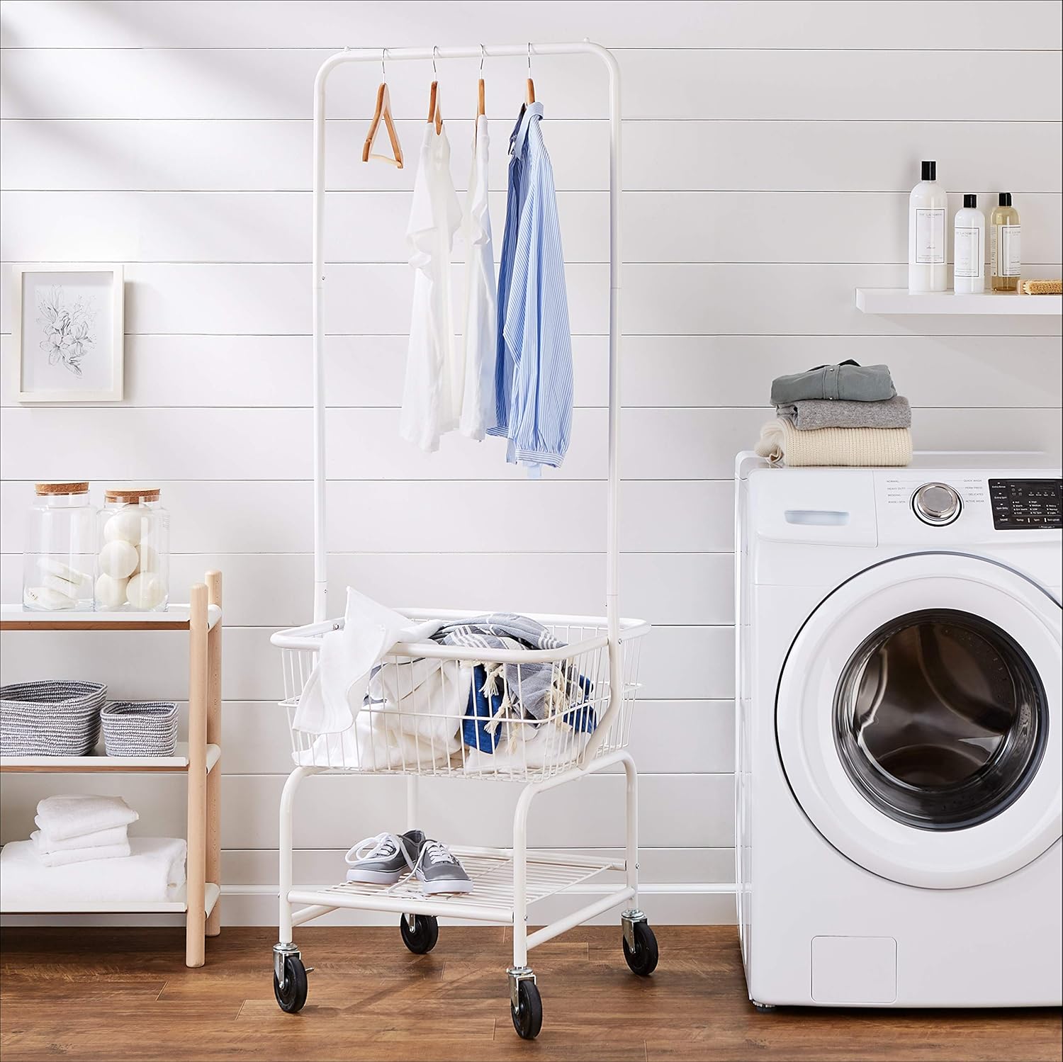 - Laundry butler provides a hanging rod, a 24-by-20-by-10-inch built-in wire basket, and a bottom shelf