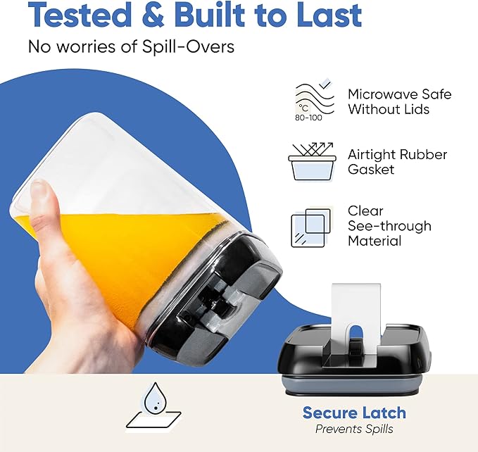 - [Superior Built ] - These flip lock kitchen canisters are 100% airtight and leak proof. These BPA Free clear food storage containers are stain free, easy to clean and portable. Perfect for refrigerator, cabinets and kitchen countertops.
