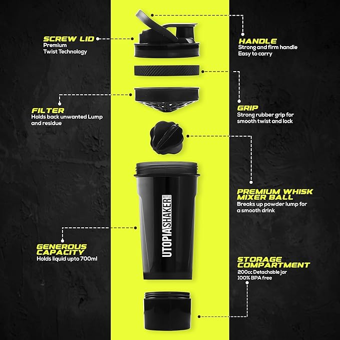 - SHAKER BOTTLE PACK - Includes units of 24-ounce / 700 ml capacity shaker bottle, a detachable protein storage jar, and a plastic whisk mixer ball. The ideal sports bottle for instant protein shakes and supplement drinks.
