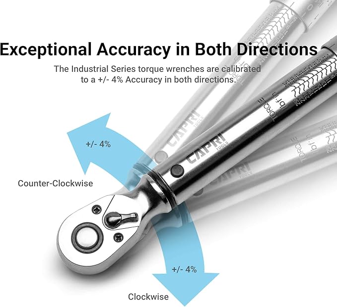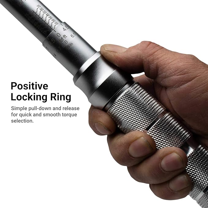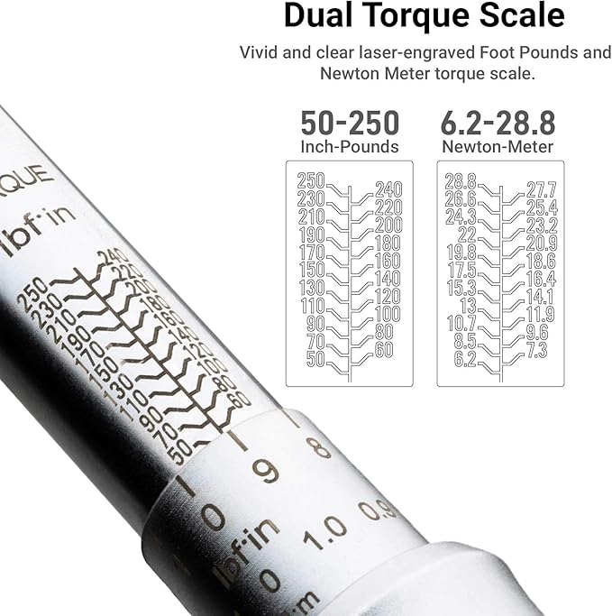 - 1/4 in. Drive with torque range of 50 to 250 in. lbs. or 5.7 to 28.2 nm. Engraved dual torque scale markings (no fading) and bi-directional calibration