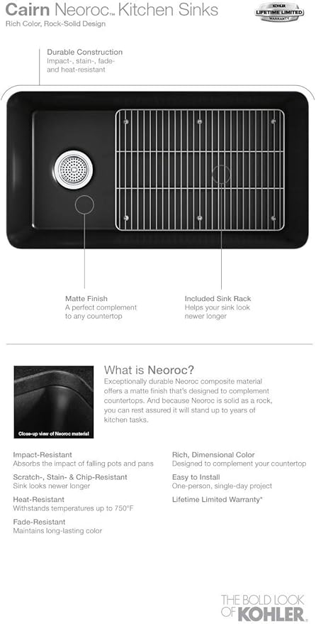 - KOHLER Neoroc composite is durable and built to withstand day-to-day cleaning tasks