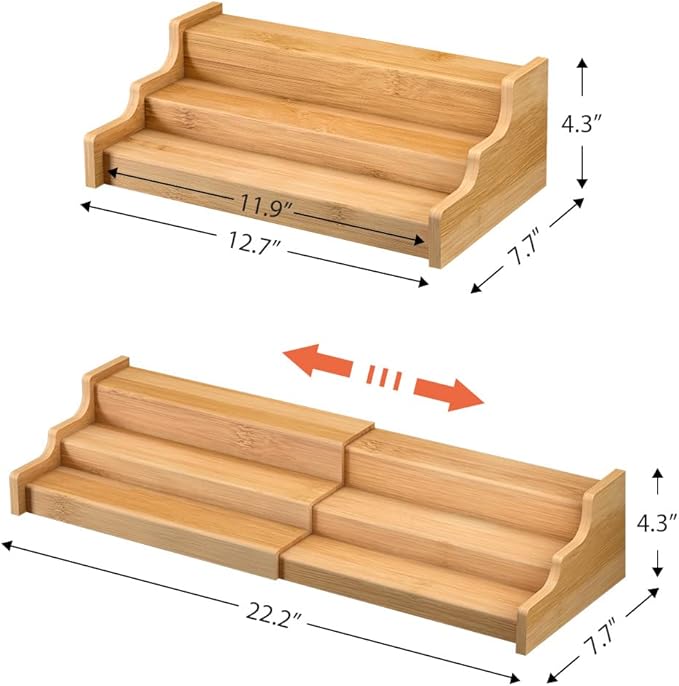 - Adjustable Cabinet Organizer: Expand the wooden spice rack to the size that fits your space and needs, size 12.70”~22.20”L * 7.70”W * 4.30”H