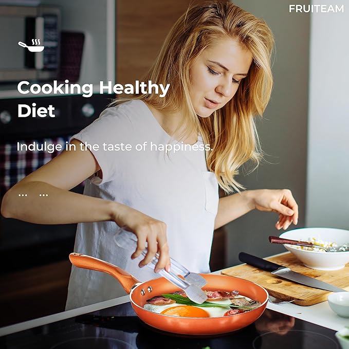 - Multifunctional 6-piece Copper Cookware Set: FRUITEAM kitchenware set includes 8-inch fry pan, 10-inch fry pan, 1.25-quart sauce pan with lid, 4.5-quart stock pot with lid, meeting your various demands of everyday cooking for your family