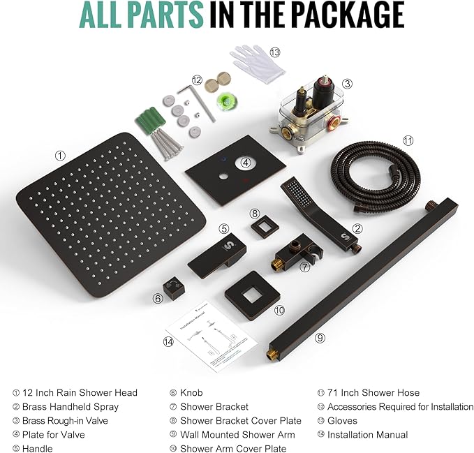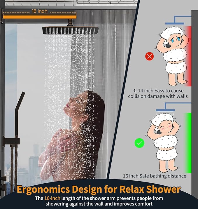 - Complete Shower System Included: This shower faucet set includes everything you need for a luxurious upgrade: a 12-inch rain shower head, a handheld shower head, a 71-inch shower hose, a 16-inch shower arm, a handheld bracket, a mixing valve, a panel, a handle, a mode knob, shower arm and bracket covers, and all necessary installation accessories.