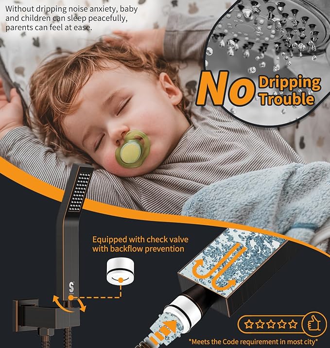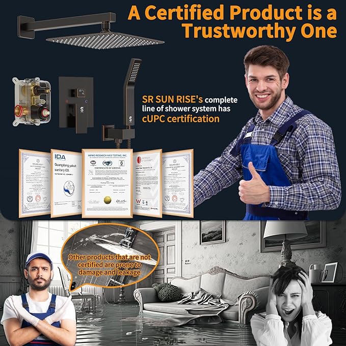 - Reliable Support & Certified Safety: Backed by 24/7 customer support, this Rain Shower Head and Handle Set ensures a stress-free experience. It features a cUPC certified pressure balance valve with built-in check valves to monitor water pressure and prevent scalding, approved by the California Energy Commission for standard 1/2-inch US pipe connections.