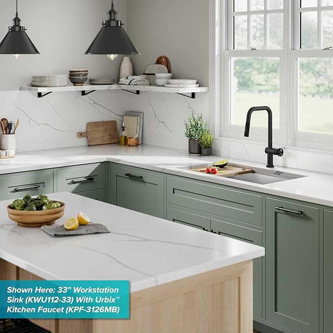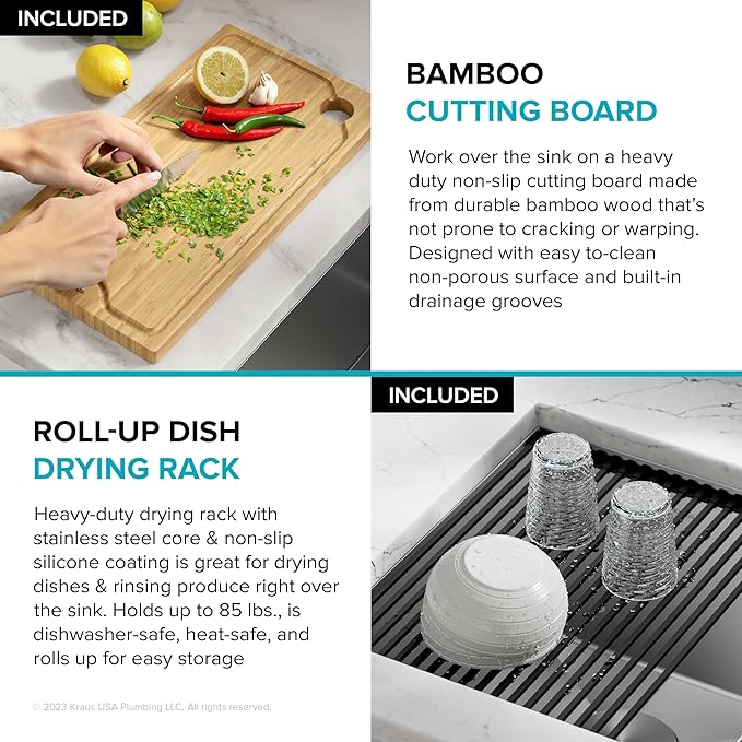 - WORKSTATION SINK with integrated ledge allows you to slide custom accessories across the sink to streamline meal prep and cleanup without losing space on the kitchen counter – 5-PIECE CHEF’S KIT INCLUDES: ROLL-UP DISH DRYING RACK perfect for rinsing produce, drying dishes, and protecting countertops from hot items; BAMBOO CUTTING BOARD won’t crack or warp; DISH GRID, STRAINER and DRAIN COVER