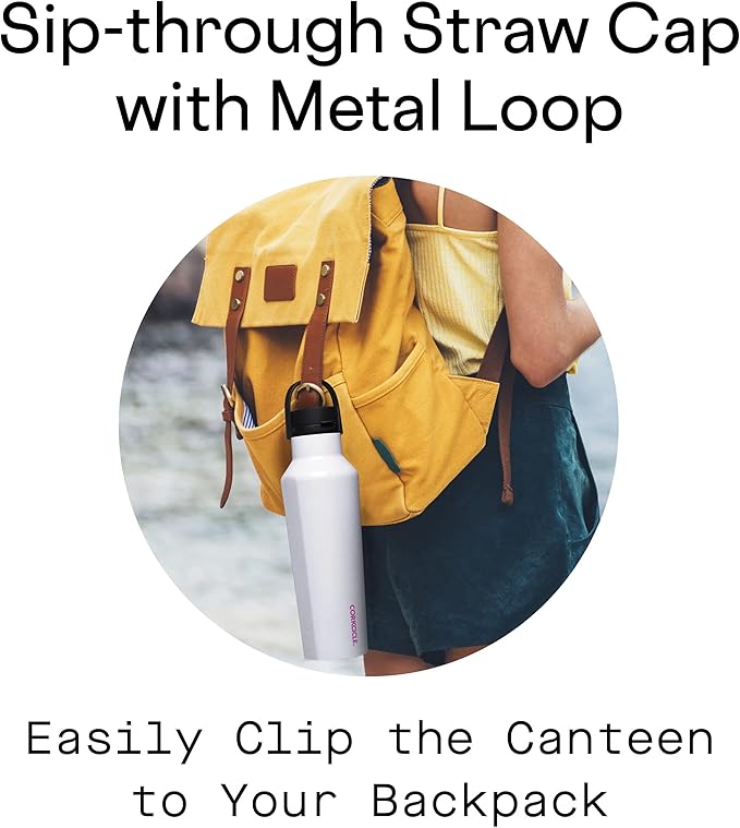 - Sip-through straw cap with metal loop - Easily clip Canteen to your backpack; Designed with a latch to prevent leaks when not in use, and attaches to a sturdy BPA-free straw