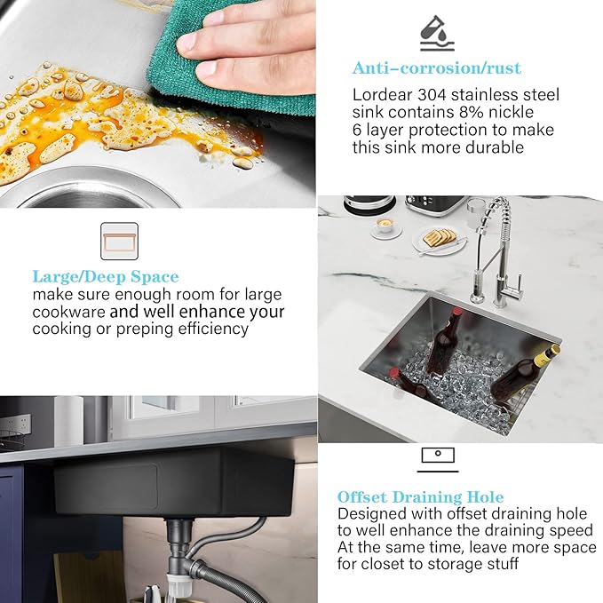 - Lordear Kitchen Sink is made with durable and long-lasting 304 stainless steel, this undermount bar kitchen sink is built to last with its 16 gauge thickness and commercial-grade brushed finish. The included bottom rinse grid also helps to prevent scratches from pots and pans.