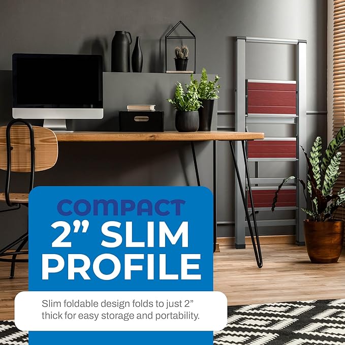 - Slim, space-saving design lets you fold the ladder to a compact size for storage. Once folded, the step ladder is barely 2" thick offering easy, convenient storage in very narrow places, say goodbye to big, bulky ladders. Lightweight and a slim design makes transportation a breeze