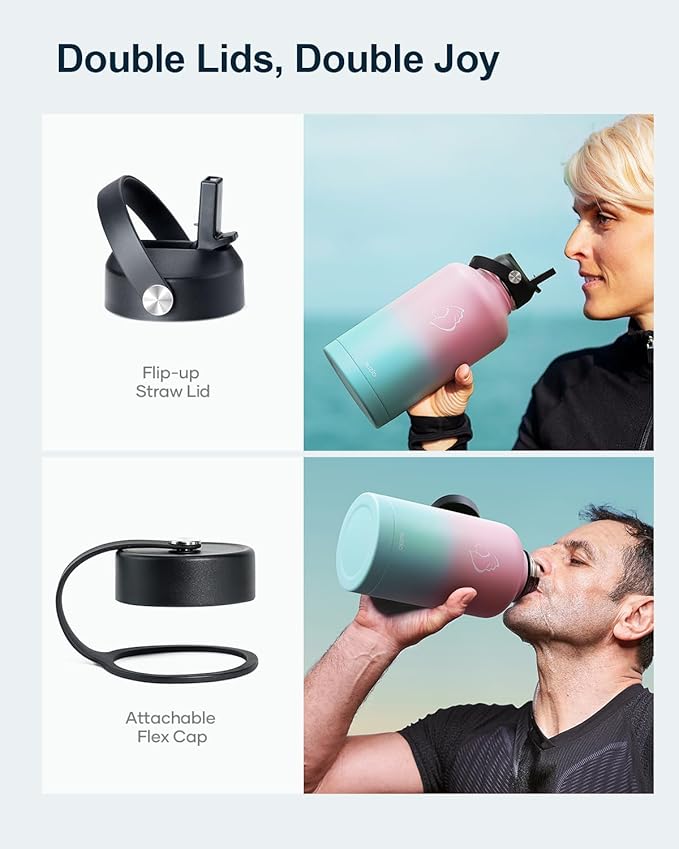 - 2 Caps Pack: This 64 oz stainless steel water bottle comes with straw lid and flex cap, the flex cap is perfect for the beach, camping and hiking, while the straw lid is suitable for cycling and road trip