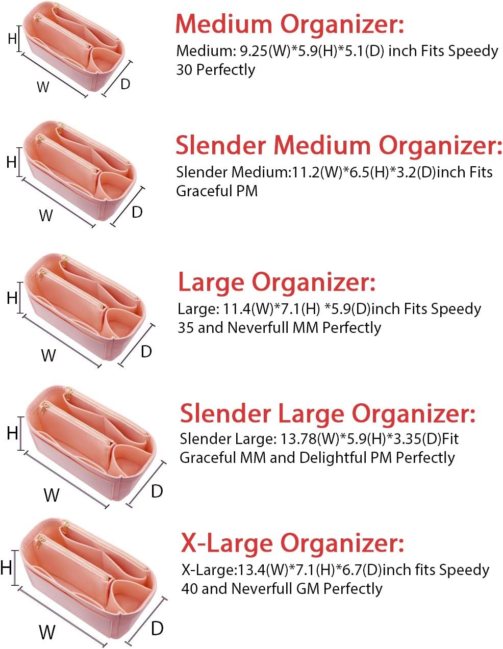 - SIZE OF BAG ORGANIZER: Medium: 9.25(L)*5.9(H)*5.1(W) inch Fits Speedy 30 Perfectly. Slender Medium: 11.2(L)*6.5(H)*3.2(W)inch Fits Graceful PM. Large: 11.4(L)*7.1(H) *5.9(W)inch Fits Speedy 35 and Neverfull MM Perfectly. Slender Large: 13.78(L)*5.9(H)*3.35(W)Fit Graceful MM and Delightful PM Perfectly. X-Large:13.4(L)*7.1(H)*6.7(W)inch fits Speedy 40 and Neverfull GM Perfectly. Portable and Compact Purse Perfectly For any Brand.L*H*W means (Length*Height*Width)