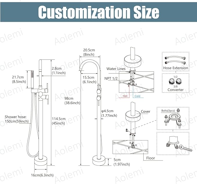 - 【What's Included】standing bathtub faucet body, brass faucet tube, handheld shower, cold and hot hose, base cover, mounting hardware and installation instruction.