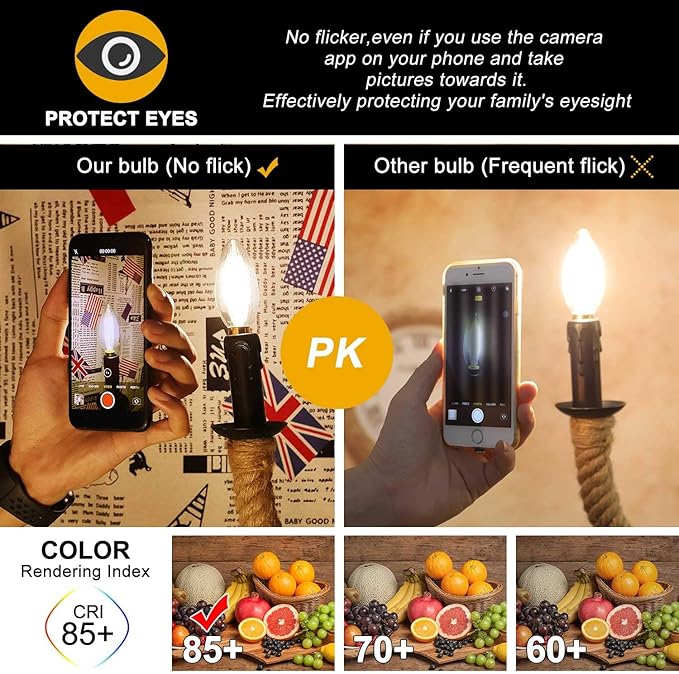 - 3000K SOFT WHITE - Vintage Edison style B11 candle torpedo shape, 3000K soft white glow, the luminous color of 3000K bulbs light a little whiter than traditional incandescent bulbs, 3000K produces soft, comfortable atmosphere, 360 degrees beam angle, with less heat and instant on