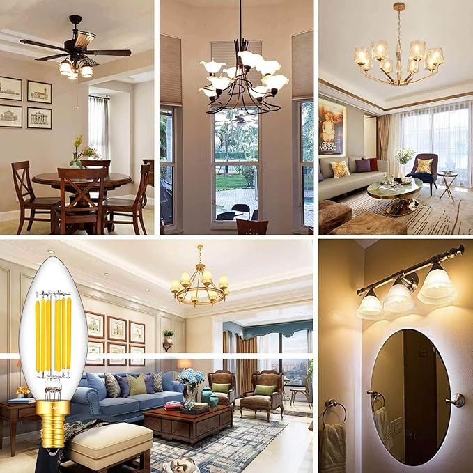 - REAL 6 WATT LED BULBS - Using 6-pcs of led filament in each led bulb and large size led chips in filaments, 6 watt actual power with 800 lumens luminous flux, high brightness and low power consumption, E12 candelabra base, AC 110-130V input voltage, with overload protection, short circuit protection and over temperature protection