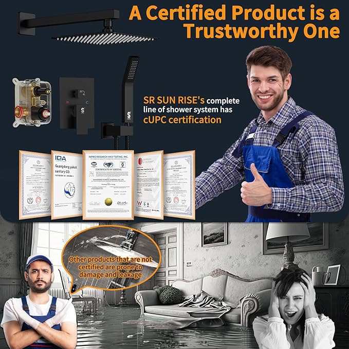 - Reliable Support & Certified Safety: Backed by 24/7 customer support, this Rain Shower Head and Handle Set ensures a stress-free experience. It features a cUPC certified pressure balance valve with built-in check valves to monitor water pressure and prevent scalding, approved by the California Energy Commission for standard 1/2-inch US pipe connections.