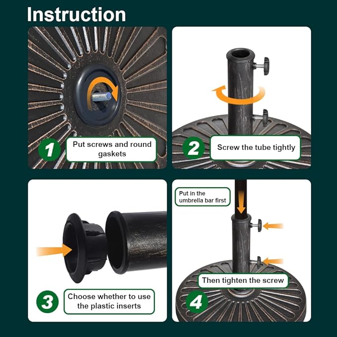 - Equipped with adjustable piston, a wide range of application, can be adjusted according to the thickness of the umbrella column.Umbrella Pole Diameter Range:φ1.5" - 1.96".