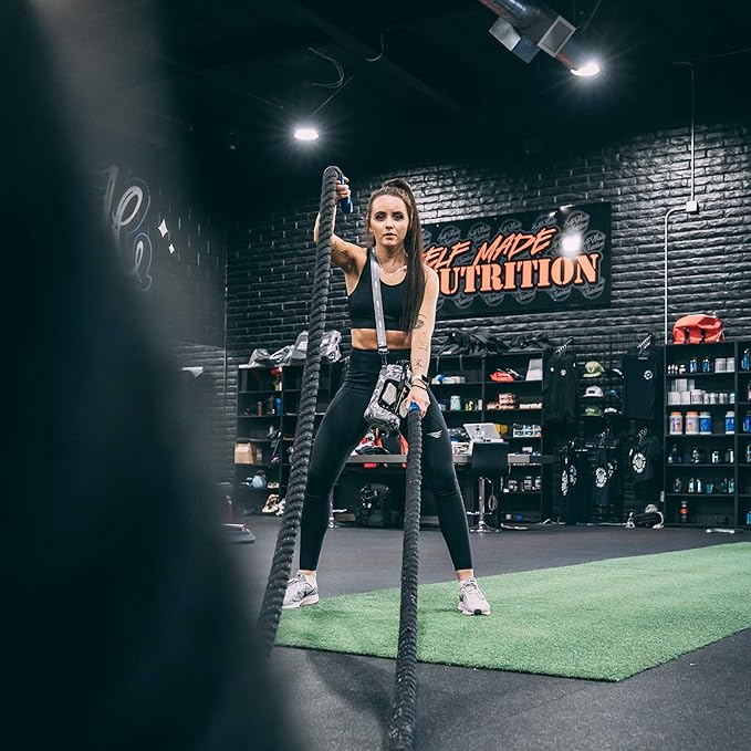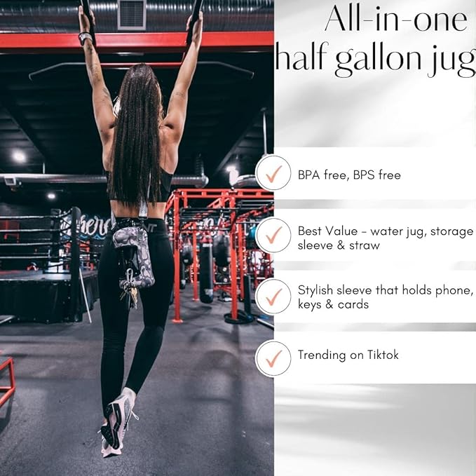 - UNIQUE STORAGE SLEEVE: Using the space under the large jug handle to store your stuff, the patent-pending removable thermal sleeve has a unique design that holds your cards and cell phone, and is finished with an in-built key chain and removable shoulder strap for convenient hands free carrying! It’s the only encased water jug that holds your things while you exercise.