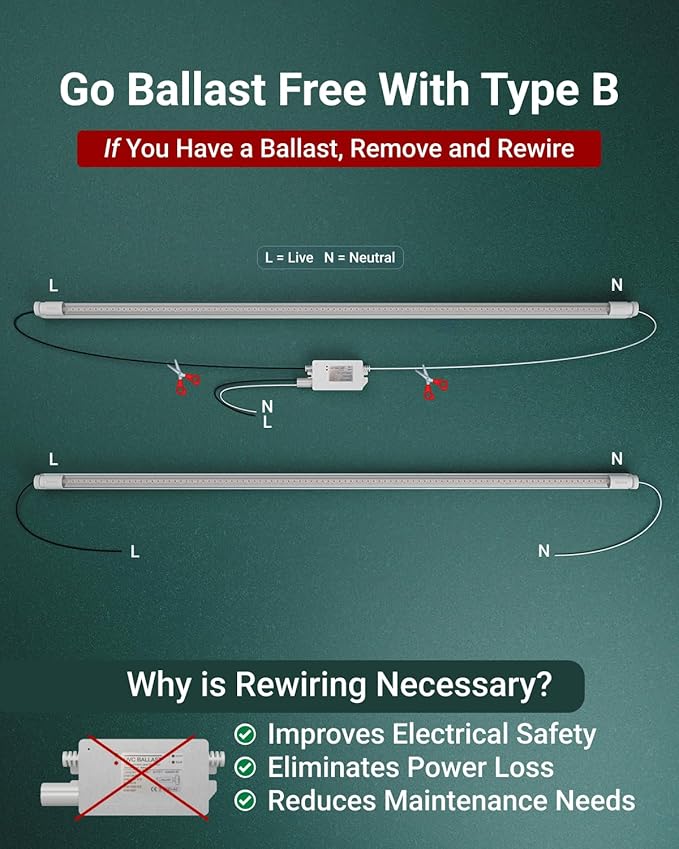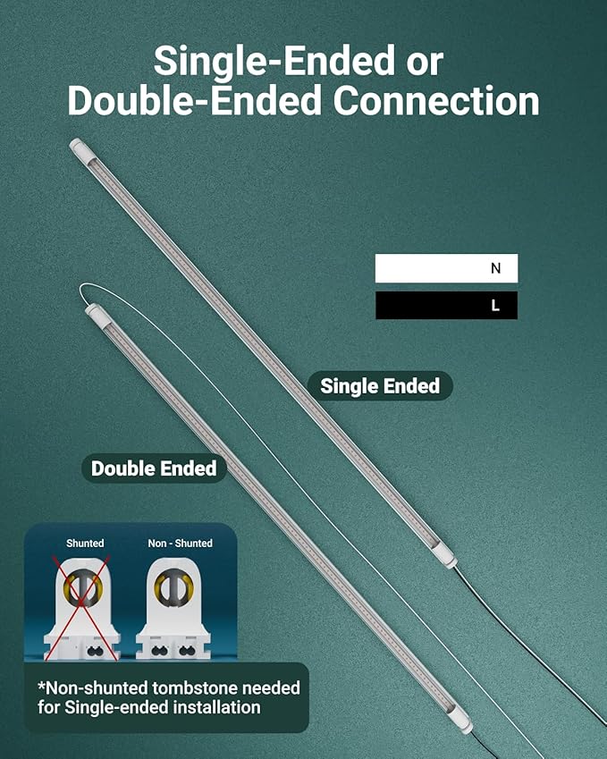 - Special Feature : Ballast Bypass (Type B), Single or Dual-End Powered, 120-277V AC, UL & FCC Certified, RoHS Compliant, Energy Efficient, T8 Tube Light, G13 Base, 4000K Neutral White, Instant-On, No Flicker, Mercury-Free, Ideal for Shop, Garage, Basement, or Laundry Lighting Ballast Bypass (Type B), Single or Dual-End Powered, 120-277V AC, UL & FCC Certified, RoHS Compliant, Energy Efficient, T8 Tube Light, G13… See more