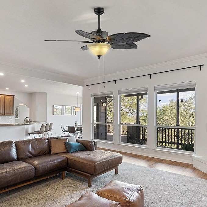 JONATHAN Y JYL9720A Poinciana 52" 3-Light Coastal Bohemian Iron/Wood Palm Leaf LED Ceiling Fan with Pull Chain Rustic, Eclectic, Transitional, Office, Living Room, Dining Room, Bedroom, Black
