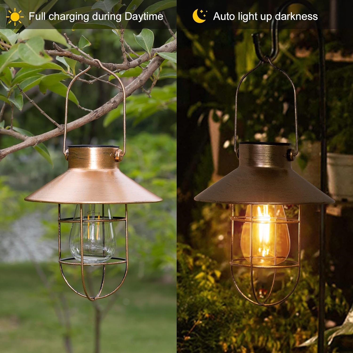 - 【SOLAR POWERED LANTERN】-Copper farmhouse lantern style design + warm LED Tungsten light bulb. The surface of the lantern has a special old process treatment, please don't worry about the quality problem.This Solar Lantern can be hung on anywhere you want, perfect for garden, yard, patio, porch, wall, pathway, driveway, lawn, camping, trees, pergolas, etc. outdoor solar landscape lighting and decoration.