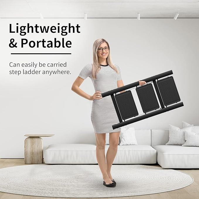 - One-hand Operation: The folding ladder comes fully assembled. You can open and close it easily. Our ladder is lighter. Women and kids can also carry it around. Unfolded: 32.28"H X 17.52"L X 27.17"W, Folded:35.24''H X 17.52"L X 2.17"W. Net Weight: 11lbs