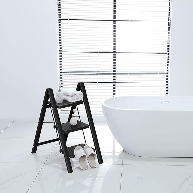 Step Ladder 3 Step Folding, Small Step Stool for Adults, Portable Anti-Slip Iron Stepladder with Wide Pedals for Home and Kitchen Use, Space Saving - Black (300 lbs)
