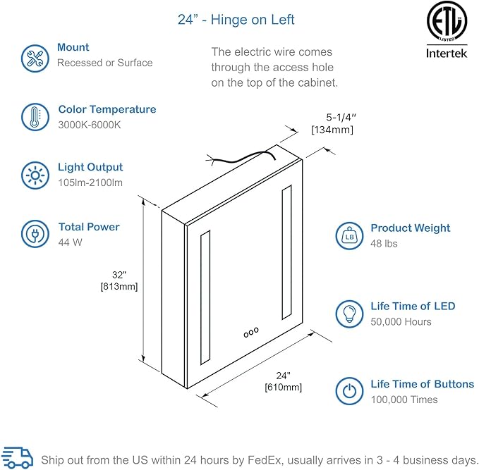 - Long-Lasting & Versatile Installation: The LED light has a lifespan of up to 50,000 hours, and the touch control is tested for 100,000 uses. Offers dual mounting options—can be surface-mounted or recessed into the wall—for a clean, seamless integration into any bathroom layout.