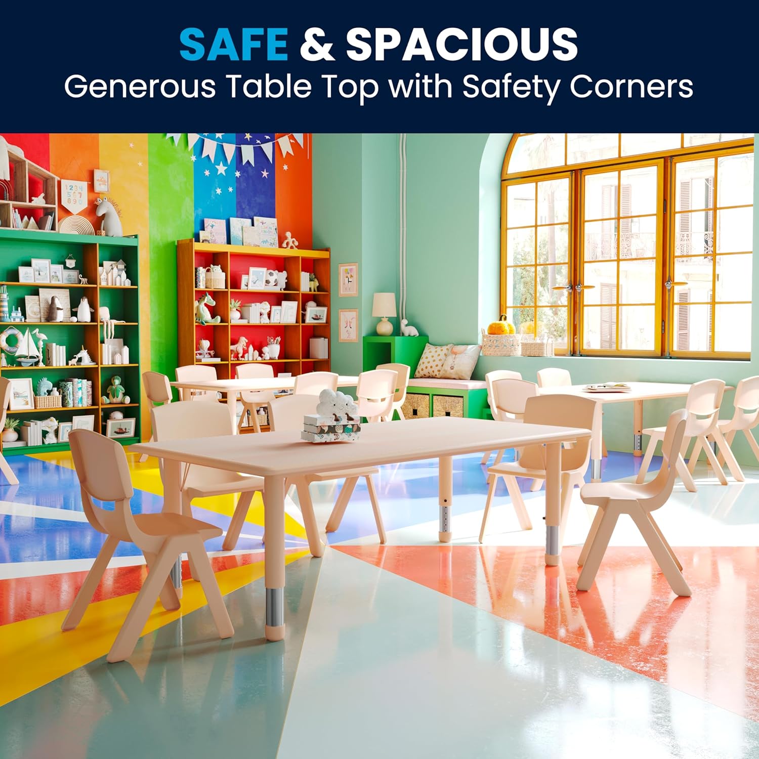 - SEATS UP TO 6 CHILDREN: Comfortably seats up to 6 children with plenty of room between each child and can be paired with 6 vibrant stackable school chairs with a height size of 6.5" to 14"