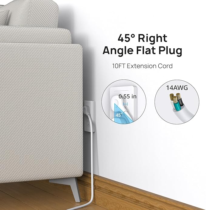 - 10ft Extension Cord Flat Plug: This surge protector is made of 14 AWG pure copper for extra durability, the 10ft extension cord is heavy duty and has better current carrying capacity (15a). The low profile right angle flat plug eliminates awkward cords from cluttering and doesn’t block the bottom receptacle