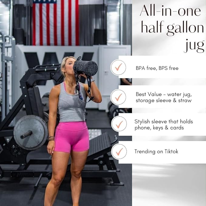 - UNIQUE STORAGE SLEEVE: Using the space under the large jug handle to store your stuff, the patent-pending removable thermal sleeve has a unique design that holds your cards and cell phone, and is finished with an in-built key chain and removable shoulder strap for convenient hands free carrying! It’s the only encased water jug that holds your things while you exercise.