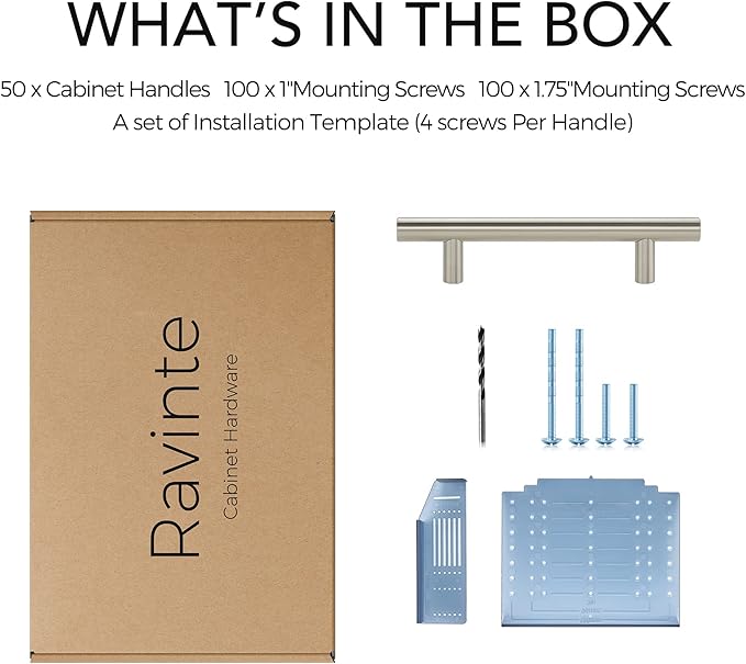 - Easy installation: brushed nickel cabinet pulls come with door and drawer templates and a drill bit. Measure the handle hole center, align the template, mark, and drill the holes. Easily install the brushed nickel hardware for your cabinets