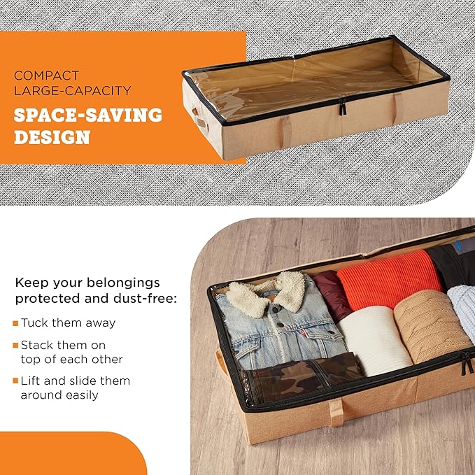 storageLAB Under Bed Storage Containers, Closet Organizers with Sturdy Handles for Clothes, Comforters, and Accessories, Use Under or at the End of the Bed - 2 Pack, Reinforced, Beige