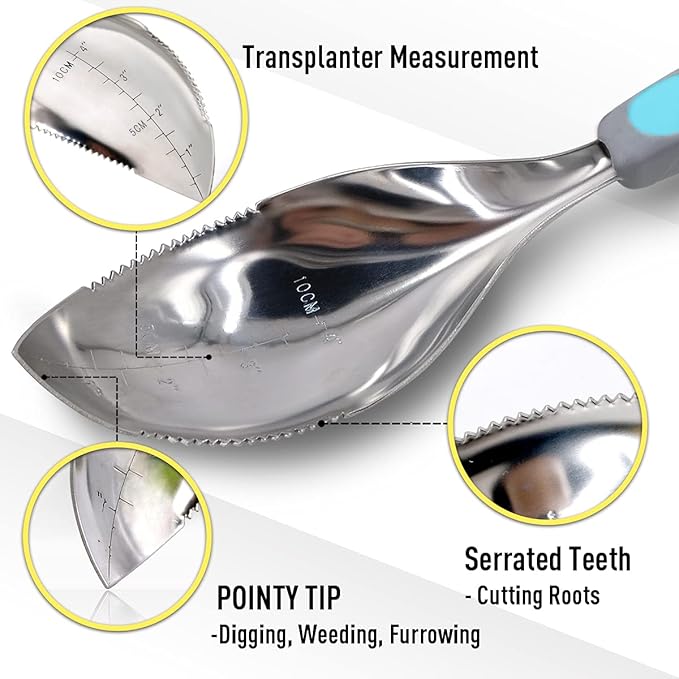 - BYE BYE "Carrying Heavy Tool Set Around" - This all-in-one garden tool can perform as cultivater, soil scoop,trowel, weeder, bulb digger. Etched measurement makes proper planting depth and the sharp serrated edges easily cut through roots and vines.