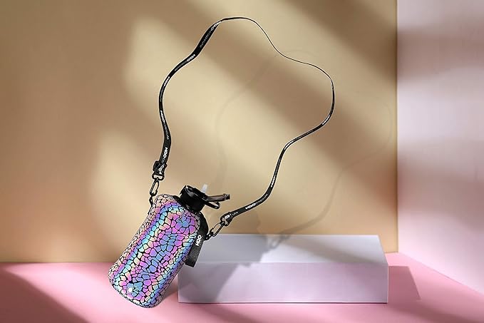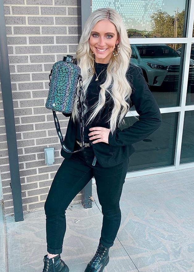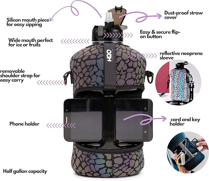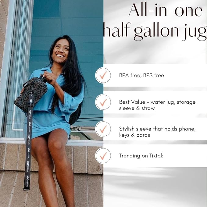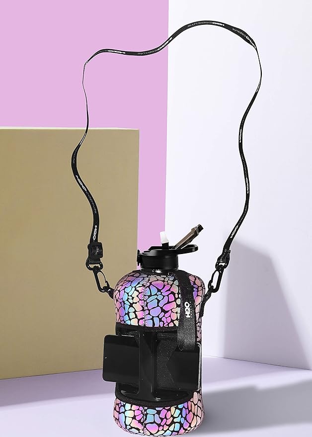 - UNIQUE STORAGE SLEEVE: Using the space under the large jug handle to store your stuff, the patent-pending removable thermal sleeve has a unique design that holds your cards and cell phone, and is finished with an in-built key chain and removable shoulder strap for convenient hands free carrying! It’s the only encased water jug that holds your things while you exercise.
